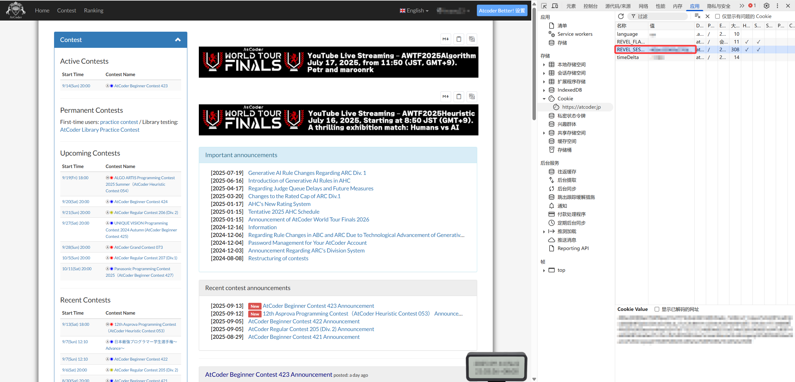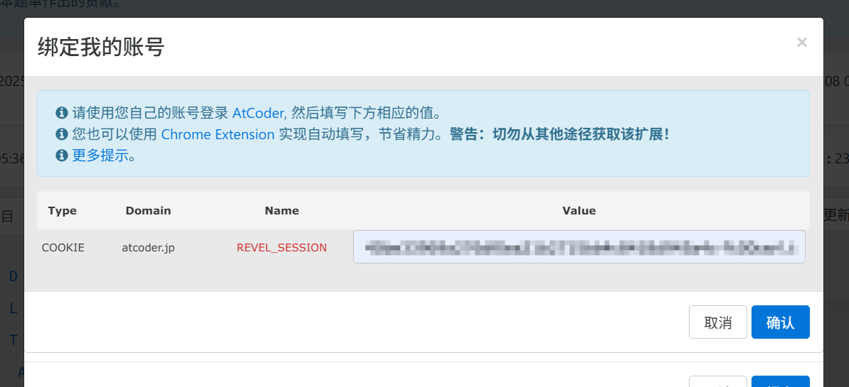 根据提交界面的提示到 AtCoder 登录/注册,提交代码,然后在 AtCoder 按 F12 进开发工具,点击右上角的“应用(Application)”“Cookies”“https://atcoder.jp”,复制右侧的 REVEL_SESSION 值,点击 VJudge 提交窗口中的“更新”,粘贴到 Vjudge 弹出的窗口中[双击右边的值(Value)后可以直接复制]。
