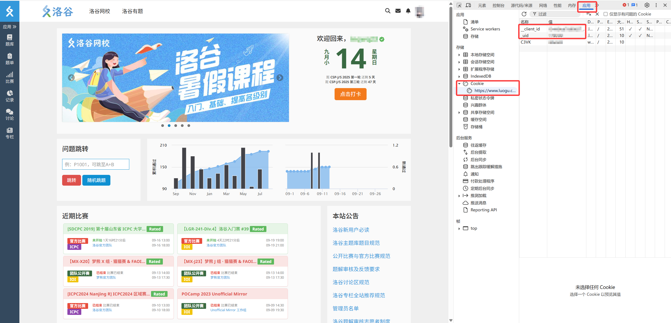 打开洛谷首页(luogu.com.cn),登录/注册账号,按 F12 进开发工具,点击右上角的“应用(Application)”“Cookies”“https://www.luogu......”,复制右侧的__client_id 和 _uid 值到 Vjudge 弹出的窗口中[双击右边的值(Value)后可以直接复制]。