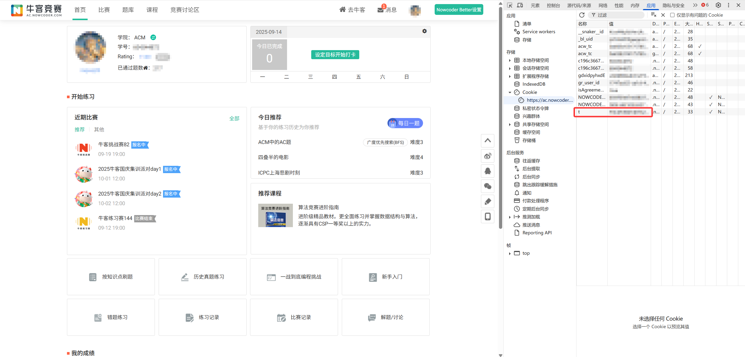 打开牛客竞赛站(ac.nowcoder.com),登录/注册账号,按 F12 进开发工具,点击右上角的“应用(Application)”“Cookies”“https://ac.nowcoder......”,复制右侧的 t 值到 Vjudge 弹出的窗口中[双击右边的值(Value)后可以直接复制]。