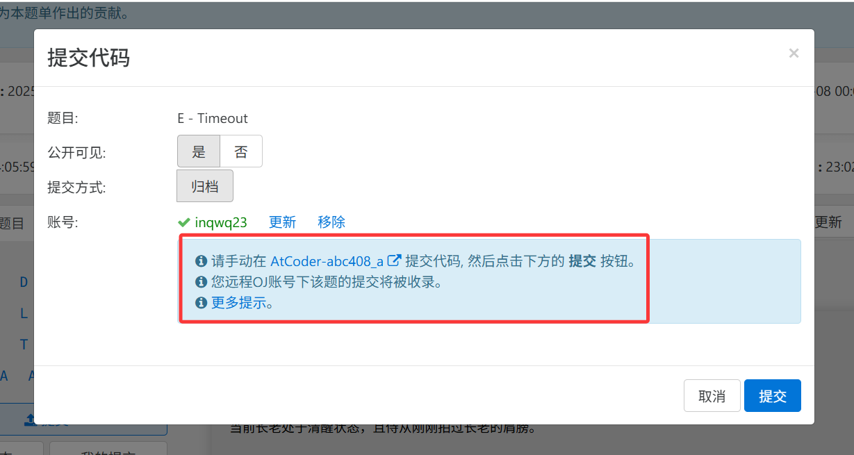 点击“提交”,再点击账号旁边的“更新”。(Atcoder 除外,直接看下面的步骤)